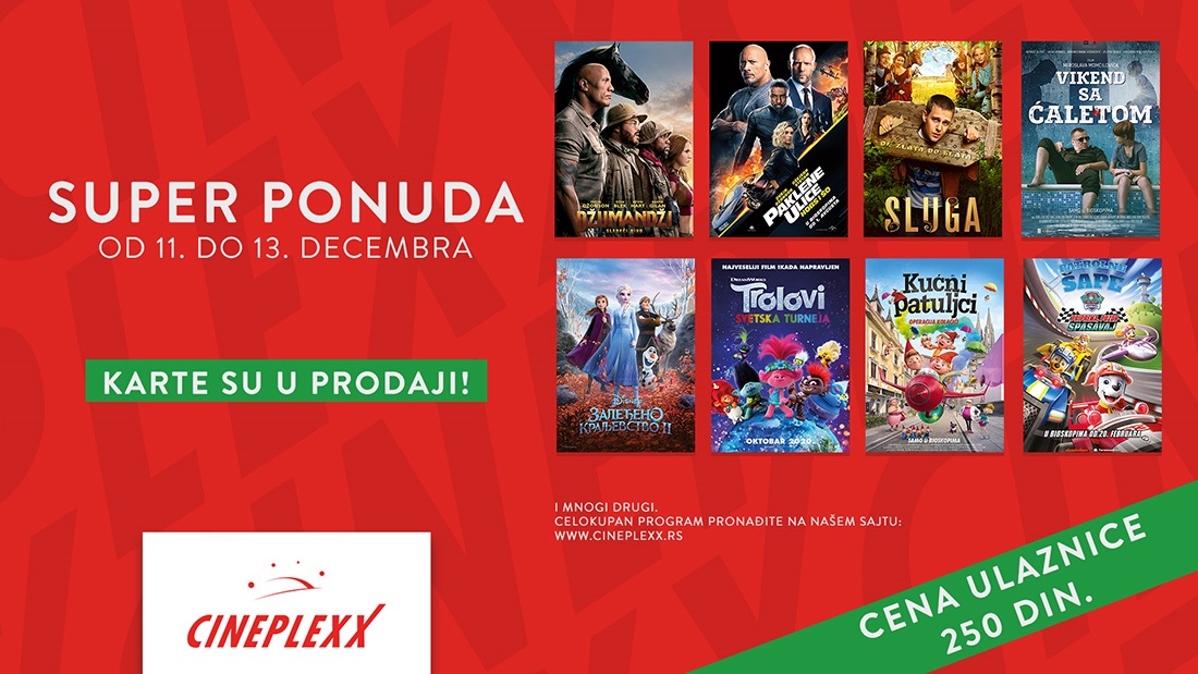Pored trenutno najpopularnijih filmskih naslova kao što su ,,Vikend sa ćaletom“ sa Nenadom Jezdićem u glavnoj ulozi koji je osvojio srca publike kako glumom tako i pričom, zatim horora ,,Stan 32“ i ,,Tripozno“, i trilera ,,Prevodioci“, na repertoaru Cineplexx bioskopa naći će se reprizni filmovi koji su ostavili najjači utisak na publiku i bili najgledaniji u periodu svog prikazivanja, među kojima su ,,Sluga” sa Milošem Bikovićem u glavnoj ulozi, malo akcije u filmu ,,Paklene ulice: Hobs i Šo”, malo avanture u filmu ,,Džumandži: Sledeći nivo” i mnogo tišine u hororu ,,Tiho mesto”. Za naše najmlađe posetioce, na njihovu veliku radost, na veliko platno vraćaju se animirane avanture ,,Zaleđeno kraljevstvo 2”, neodoljive kuce u filmu ,,Patrolne šape: Priprema, pozor, spasavaj”,,Kućni patuljci” i drugi.