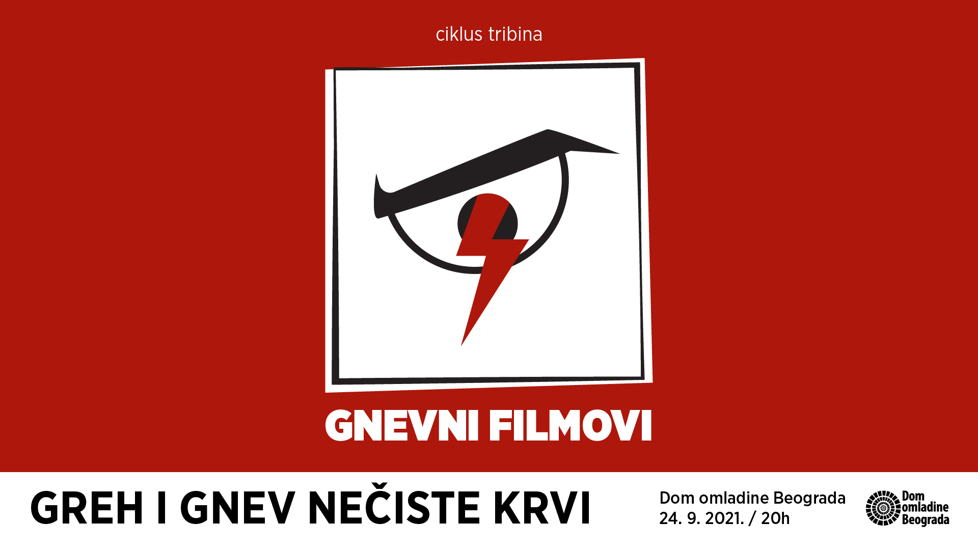 Podsećamo… Dom omladine Beograda je u februaru 2020. godine pokrenuo ciklus filmskih tribina koji vode filmski kritičari Zoran Janković i Đorđe Bajić, dugogodišnji hroničari srpskog filma. Drugi ciklus „Gnevnih filmova“ će tokom 2021. godine predstaviti osam tribina u čijem će fokusu biti najnovija filmska i serijska ostvarenja srpskih autora, kao i na probleme i fenomene savremenog društva koje oni problematizuju i koji se u njima oslikavaju. Kako živimo u turbulentna vremena puna buke i besa, taj sveprožimajući gnev je neretko pokretačka snaga filmskih autora. Ovaj ciklus tribina i u novoj sezoni predstavlja svojevrsnu hronologiju aktuelnih filmskih dešavanja u Srbiji i svetu, a istovremeno će, sagledavano kroz vizure naših stvaralaca, biti i svedočanstvo vremena u kome živimo.