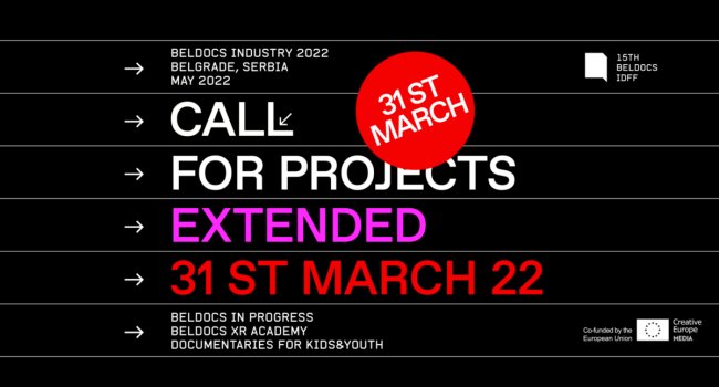 Obaveštavamo vas da je rok za prijave za Beldoks industri program (koji će biti održan u sklopu 15. Beldoks festivala) produžen do 31. marta 2022. godine. Beldocs industri program ima tri sekcije: Beldocs in Progress, Beldocs Academy i Beldocs Kids & Youth.