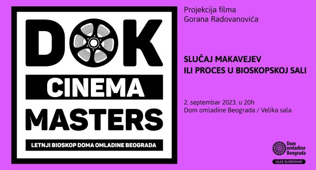 U subotu, 2. septembra od 20 sti u Velikoj sali Doma omladine Beograda (DOB), u sklopu ciklusa „DOK CINEMA MASTERS“, biće priređeni projekcija i razgovor o filmu „Slučaj Makavejev ili Proces u bioskopskoj Sali“, zapaženom ostvarenju nastalom uz podršku i FCS-a. Gost će biti Goran Radovanović, reditelj i scenarista ovog filma, a moderatorka Jovana Nikolić, producentkinja. Ovaj srpski film iz 2029. godine traje 74 minuta. Ulaz je slobodan.