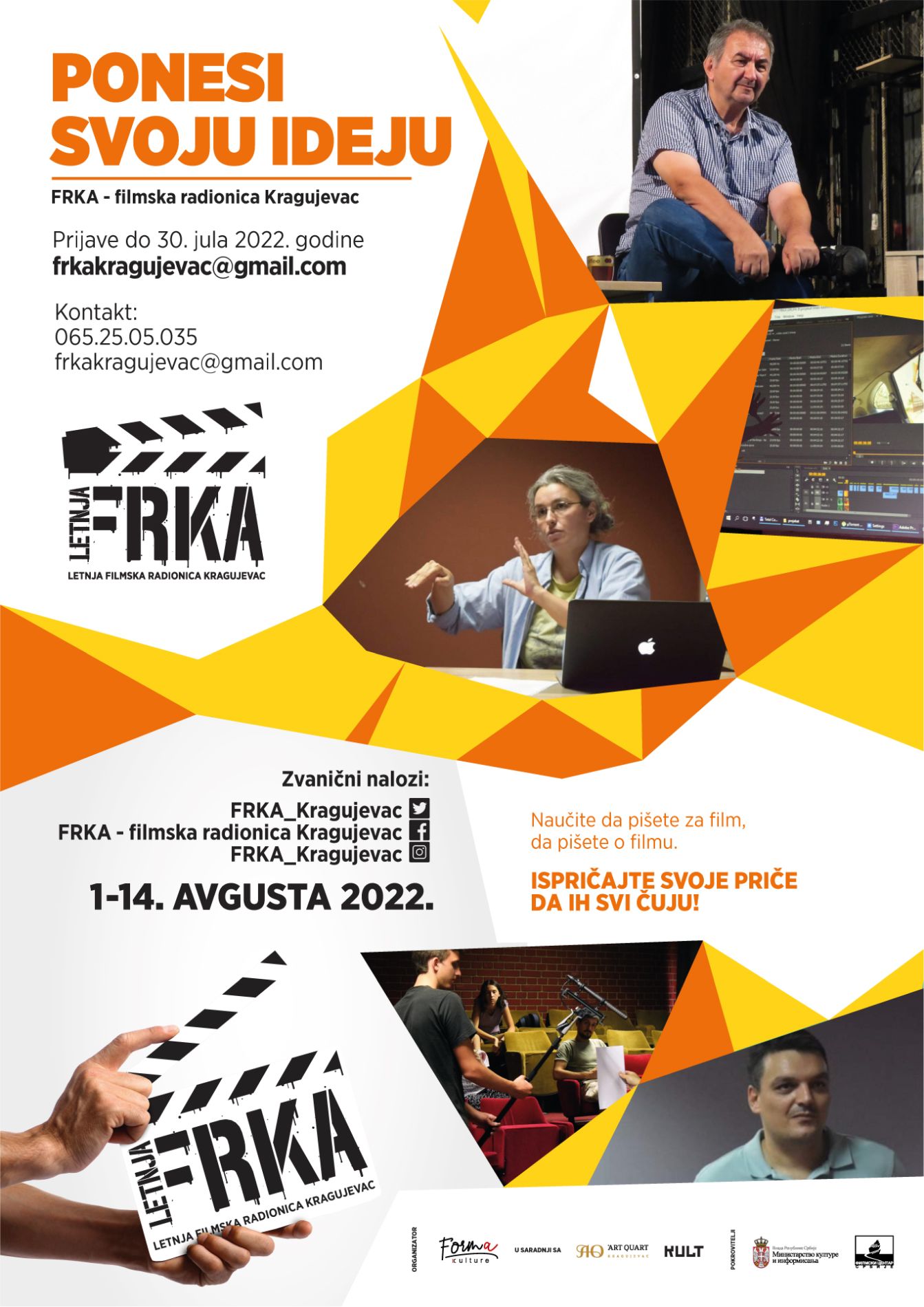 FRKA se održava u dva termina, prepodnevnom i večernjem. Učešće na radionici je besplatno, broj mesta je ograničen, a prijave su otvorene do 30. jula 2022. godine. Svi zainteresovani polaznici mogu se prijaviti putem mejla: frkakragujevac@gmail.com.