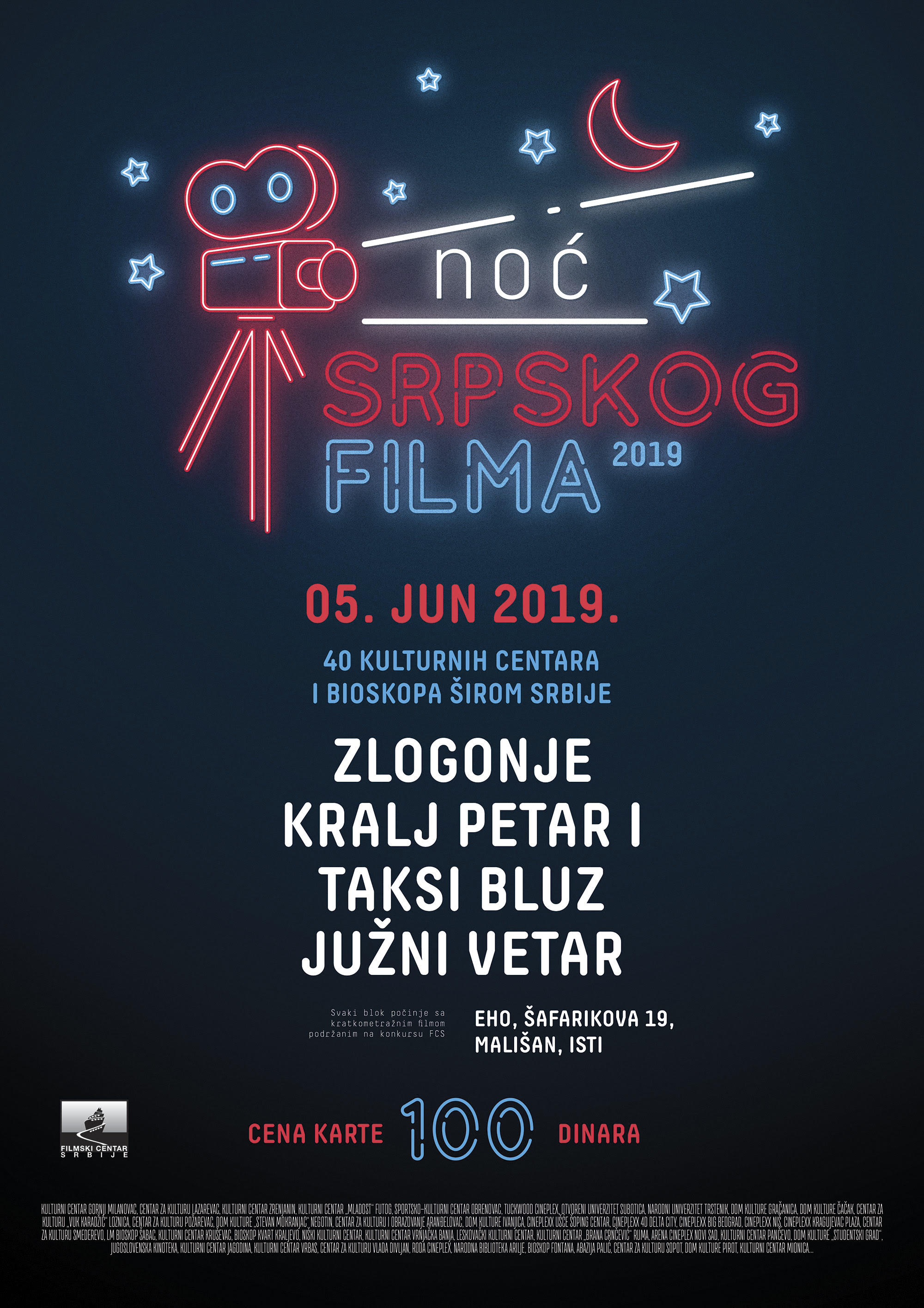 Manifestacija „Noć srpskog filma“ biće održana u Beogradu, Novom Sadu, Nišu, Pančevu, Lazarevcu, Zrenjaninu, Futogu, Obrenovcu, Subotici, Trsteniku, Gračanici, Paliću, Čačku, Loznici, Gornjem Milanovcu, Požarevcu, Negotinu, Aranđelovcu, Ivanjici, Kragujevcu, Smederevu, Šapcu, Kruševcu, Kraljevu, Vrnjačkoj Banji, Leskovcu, Rumi, Jagodini, Vrbasu, Arilju, Pirotu i Mionici. Organizator manifestacije je Filmski centar Srbije, u partnerstvu sa bioskopima širom zemlje.