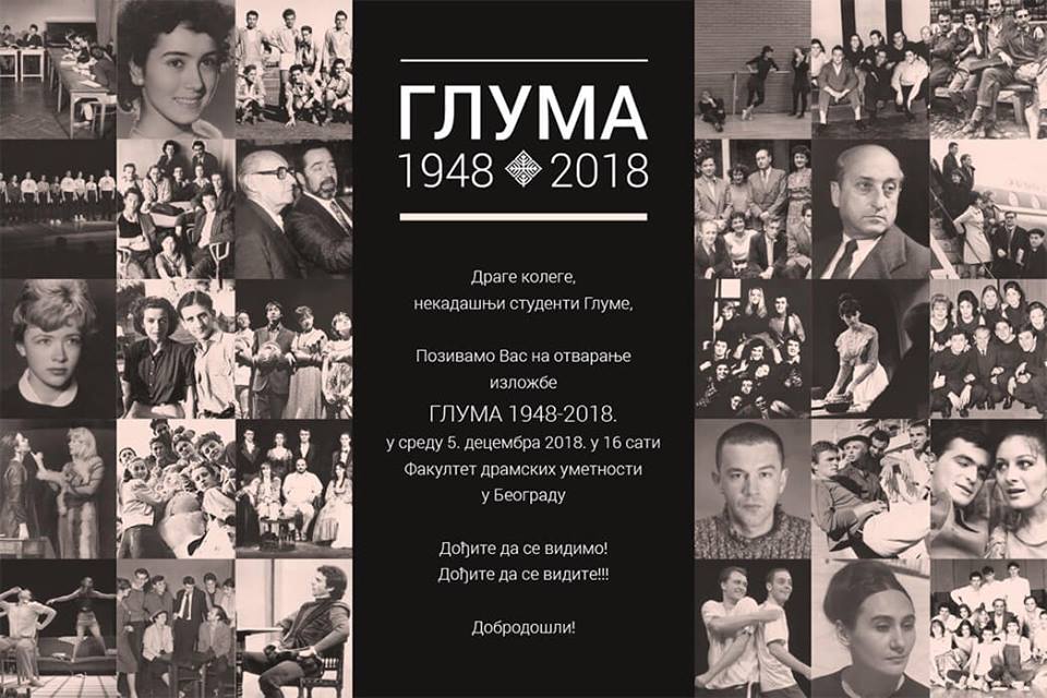 Sutra, 5. decembra, u 16 časova na Fakultetu dramskih umetnosti (u Bulevaru umetnosti 20, na Novom Beogradu) biće otvorena izložba „ Gluma 1948-2018“. Ulaz je slobodan.