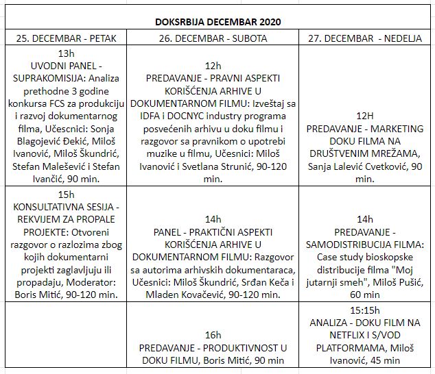 Deseta DOKSrbija radionica održaće se onlajn putem ZOOM aplikacije od 25. do 27. decembra. Ovoga puta, fokus radionice će biti na analizi konkursa za dokumentarni film u poslednje tri godine i upotrebi arhivske građe u dokumentarnom filmu. Radionica je zamišljene kao niz otvorenih panela i predavanja na koje su dobrodošli svi zainteresovani da razgovaraju i diskutuju o temama važnim za dokumentarni sektor. A ovako izgleda precizana satnica planiranih aktivnosti.