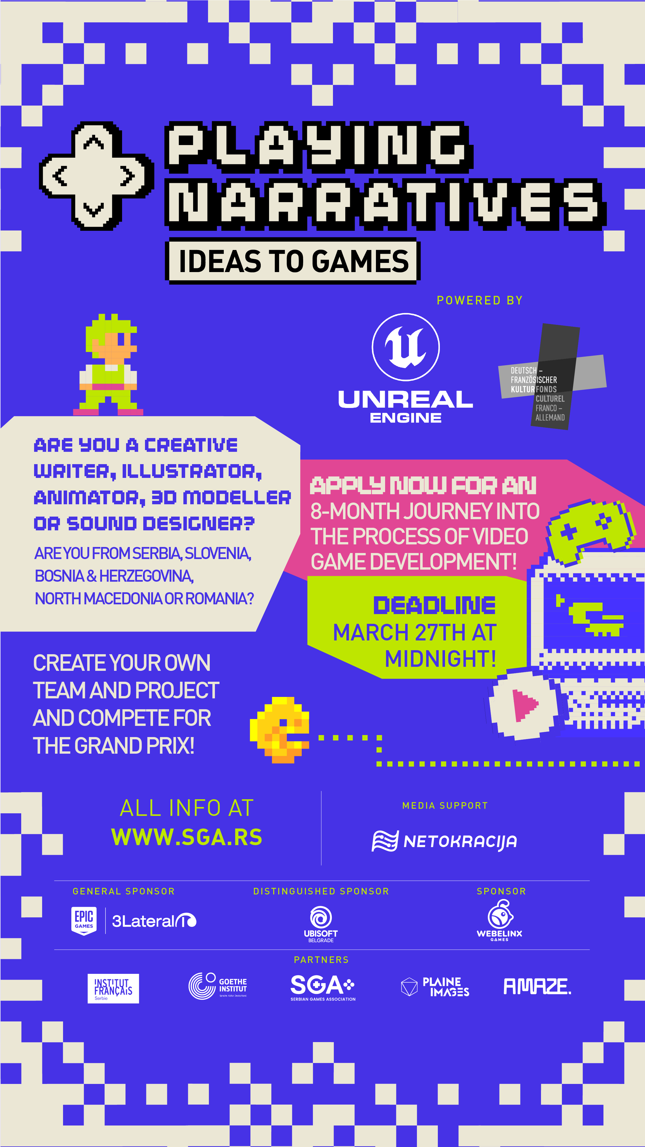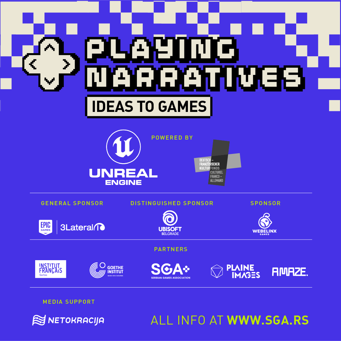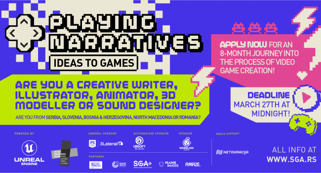 Playing Narratives je zajednička inicijativa Francuskog instituta i Goethe-Instituta u Srbiji, u saradnji sa SGA, koja je tokom prošle godine uspešno realizovala svoj pilot program u koji su se uključili brojni partneri iz zemlje i inostranstva, a čiji su korisnici bili mladi kreativci iz cele Srbije, koji su bili zainteresovani da zakorače u profesionalne vode u okvirima gejming industrije. Do kraja programa, polovina njih je već ostvarila profesionalne prilike u nekoj od srpskih domaćih kompanija.
