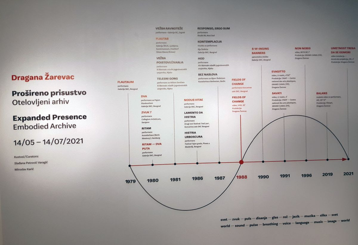„Ako je telo u performansu Žarevac produžetak muzike, video je produžetak/nastavak performansa – performansa sa zvukom, muzičkog performansa i same muzike. Kompozitor Miša Savić 1987. piše da rad Dragane Žarevac „nije ni apsolutna muzika ni samostalna slika: reč je o događaju u međuprostoru muzike, ukočene rastegnute u beskonačnost vremena i slike koja je oživljena jezikom muzike. Ovaj događaj sam po sebi ne govori i eksplicitno ne izražava ništa već omogućuje da u toku njegovog odvijanja prisustvujemo razvlačenju jednog beskrajno kratkog trenutka ili sažetije formulisano, maksimalno koncentrisanoj fikciji“. Slađana Petrović Varagić, u kustoskom tekstu koji prati aktuelnu izložbu u Legatu.