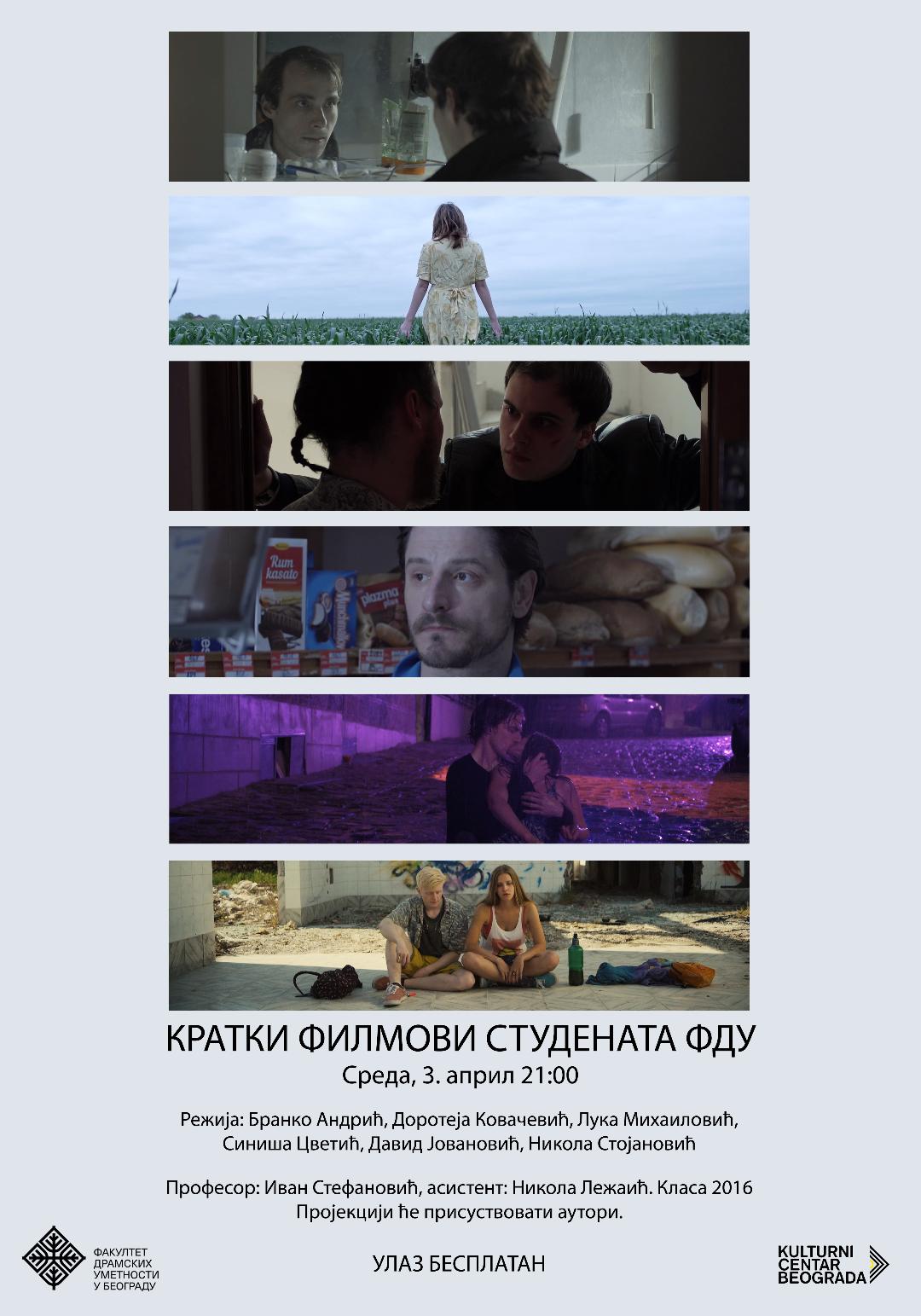 U sredu, 3. aprila, u 21 čas, u Dvorani Kulturnog centra Beograda održaće se projekcija kratkih filmova studenata FDU umesto redovnog repertoara. Filmovi su nastali na časovima profesora Ivana Stefanovića i asistenta Nikole Ležaića. Projekciji će prisustvovati autori i glumci. Ulaz je besplatan.