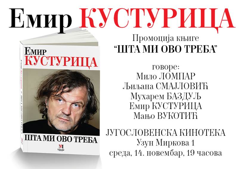 Sutra, u sredu, 14. novembra, u Jugoslovenskoj kinoteci (u Uzun Mirkovoj 1, u Beogradu) biće održana promocija knjige „Šta mi ovo treba“ Emira Kusturice (u izdanju kuće Vukotić Medija).